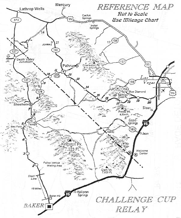 contains 20 individual relay legs and starts outside of Baker, goes through the cities of