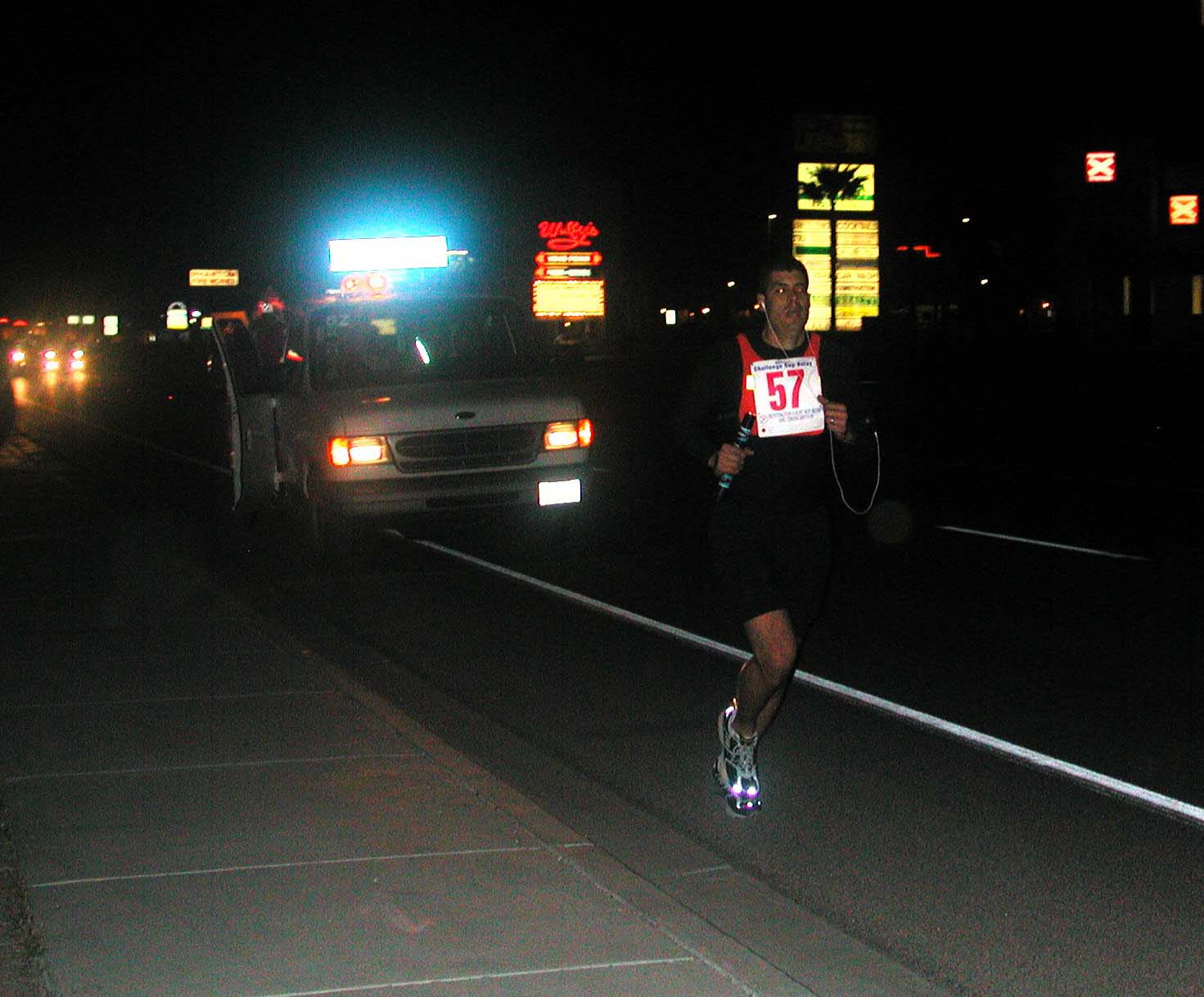 runner (Team #57) leading what seems to be an endless line of runners and support vehicles