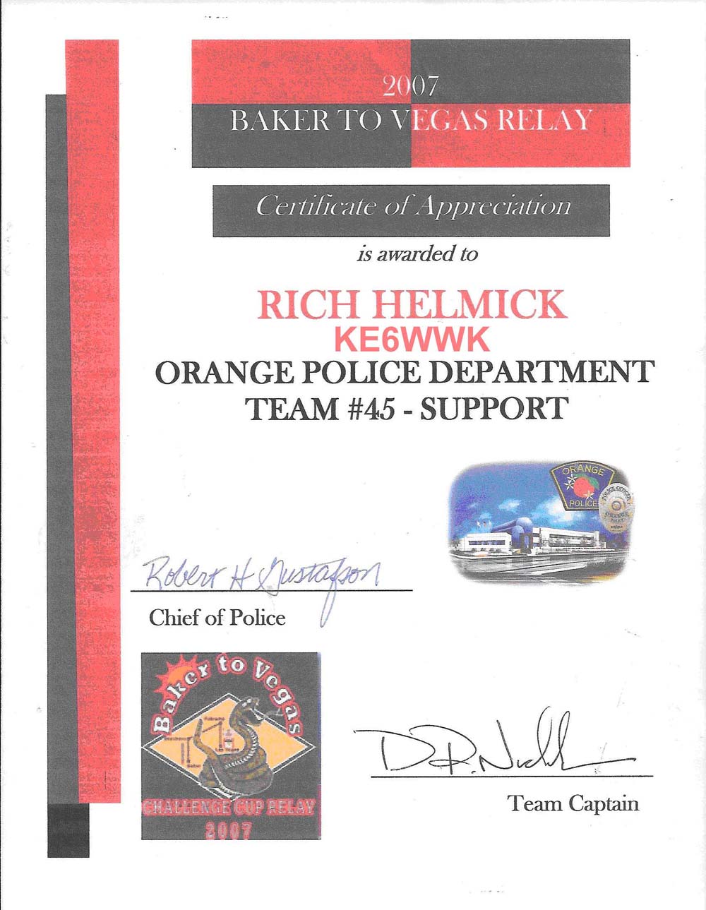 radio operator who helped the OPD running team with the Baker-to-Vegas race, by Chief Bob