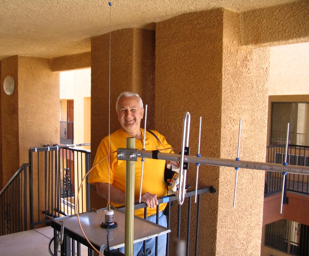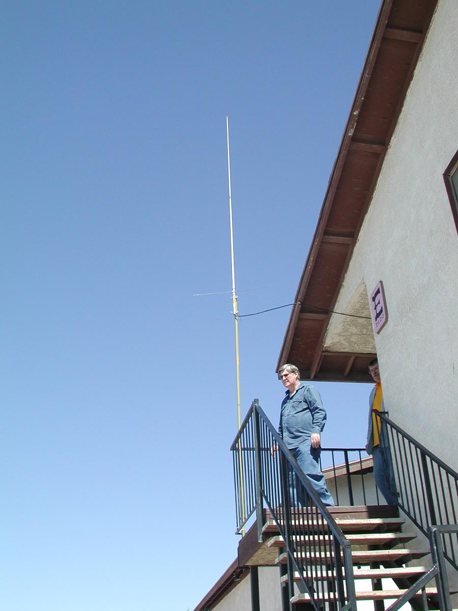 radio checks. Mike-KF6QFY inspects the temporary APRS 2M vertical that was set-up on a