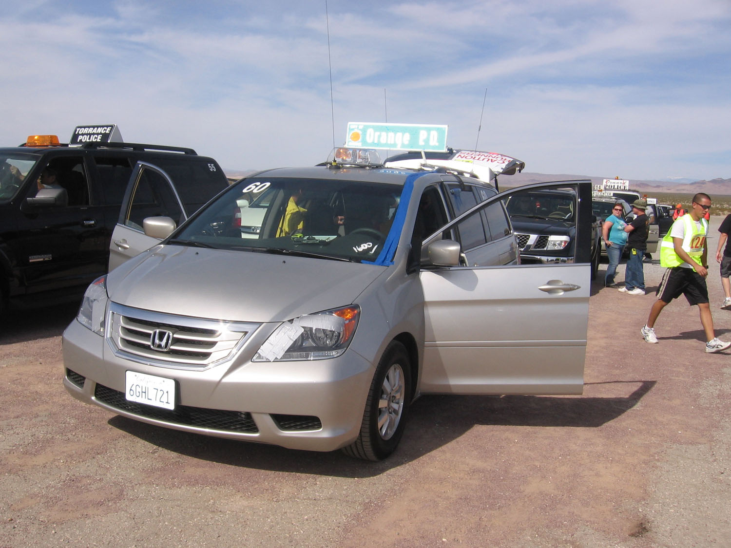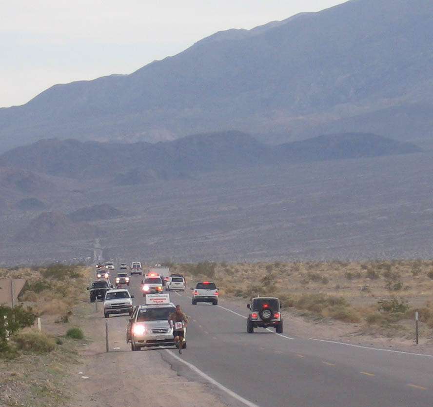 Vehicle and a long stream of other runners and support vehicles on the long desert course. |