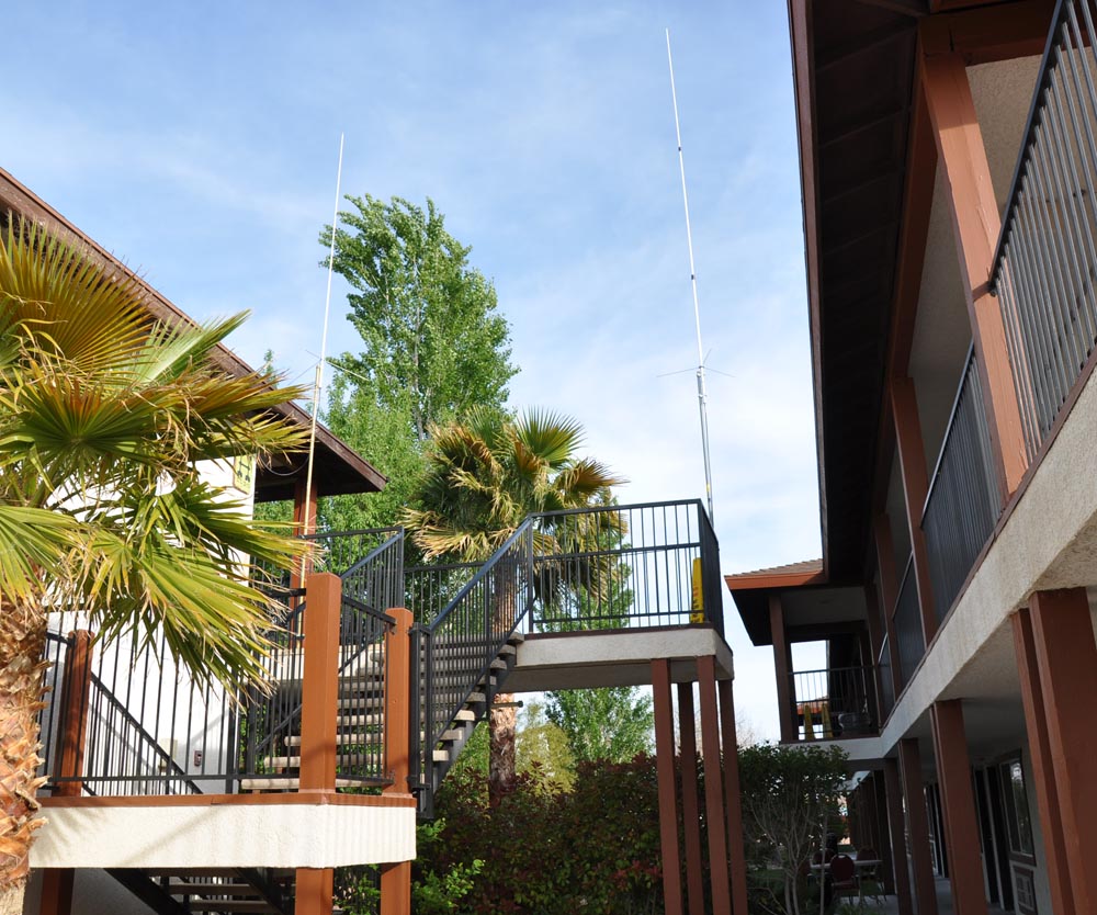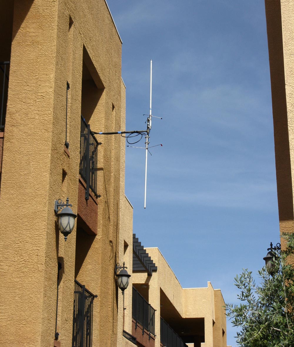 clamped to the second-story railings. The taller antenna on the right is for 144/440 voice