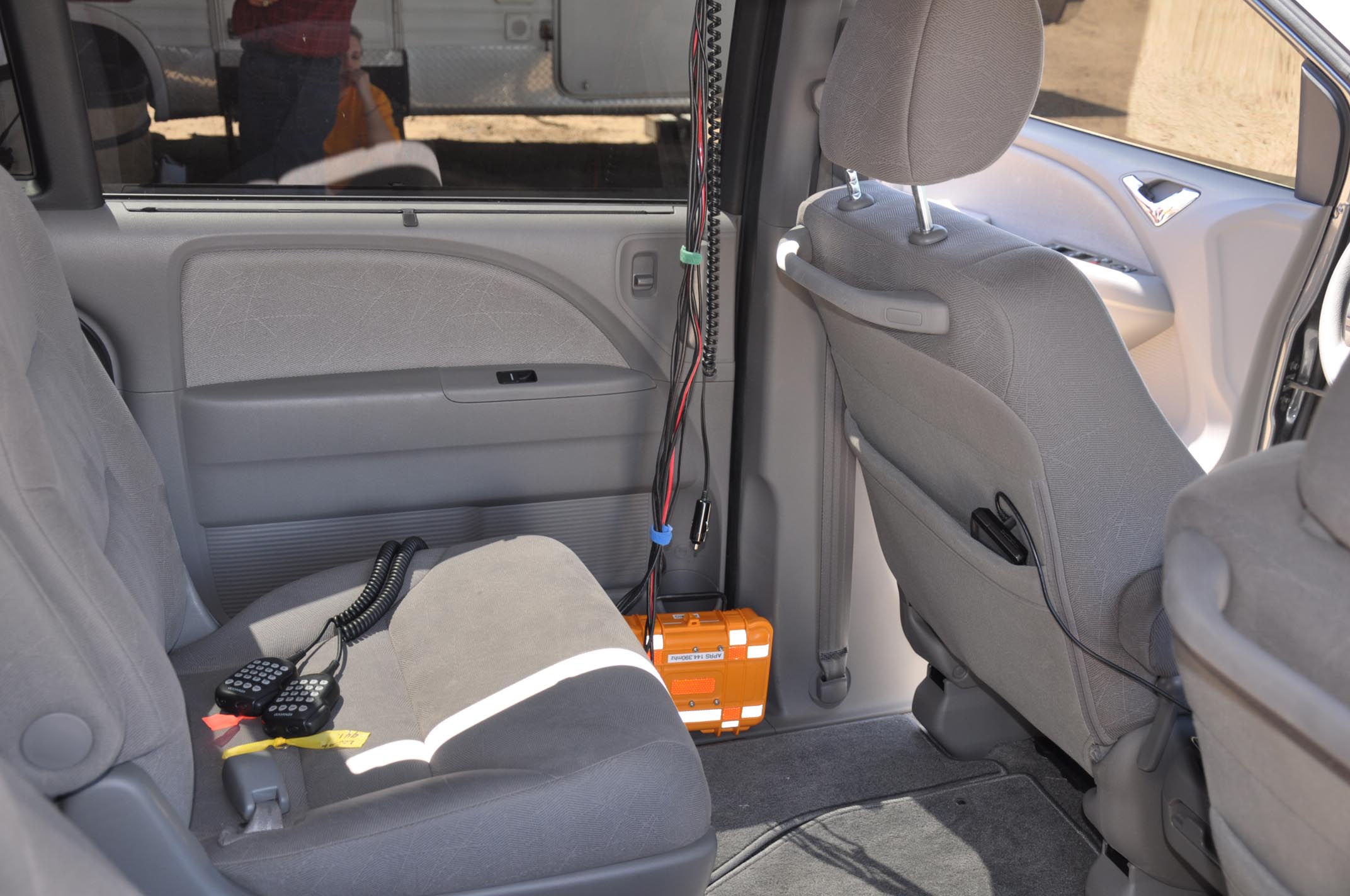 Officer for COAR) finishes installing the "Follow Vehicle" with three radios and
