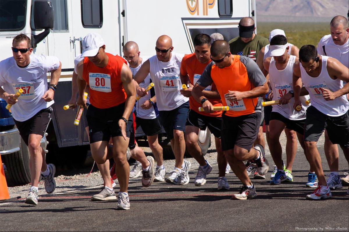 The race starts for Team 41 (fourth runner from left) and about 20 other