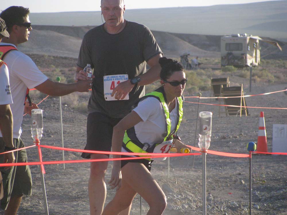 baton as she begins Stage 6. Officer Ray Winick grabs a bottle of water from the