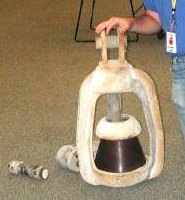 Dino Darling - K6RIX [now KX6D presented our August Program. Dino, a man not scared of heights, gave us a presentation on the recent changing of the guy wires on the 750' tall tower at KFI in La Mirada. These wires have been up for many years and for safety reasons were replaced. Dino got to ride up the tower and 'help' the crew. Dino's pictures were outstanding as was his recollection of how the task was accomplished. He donated to the club raffle one of the old guy insulators used on the tower (See picture).