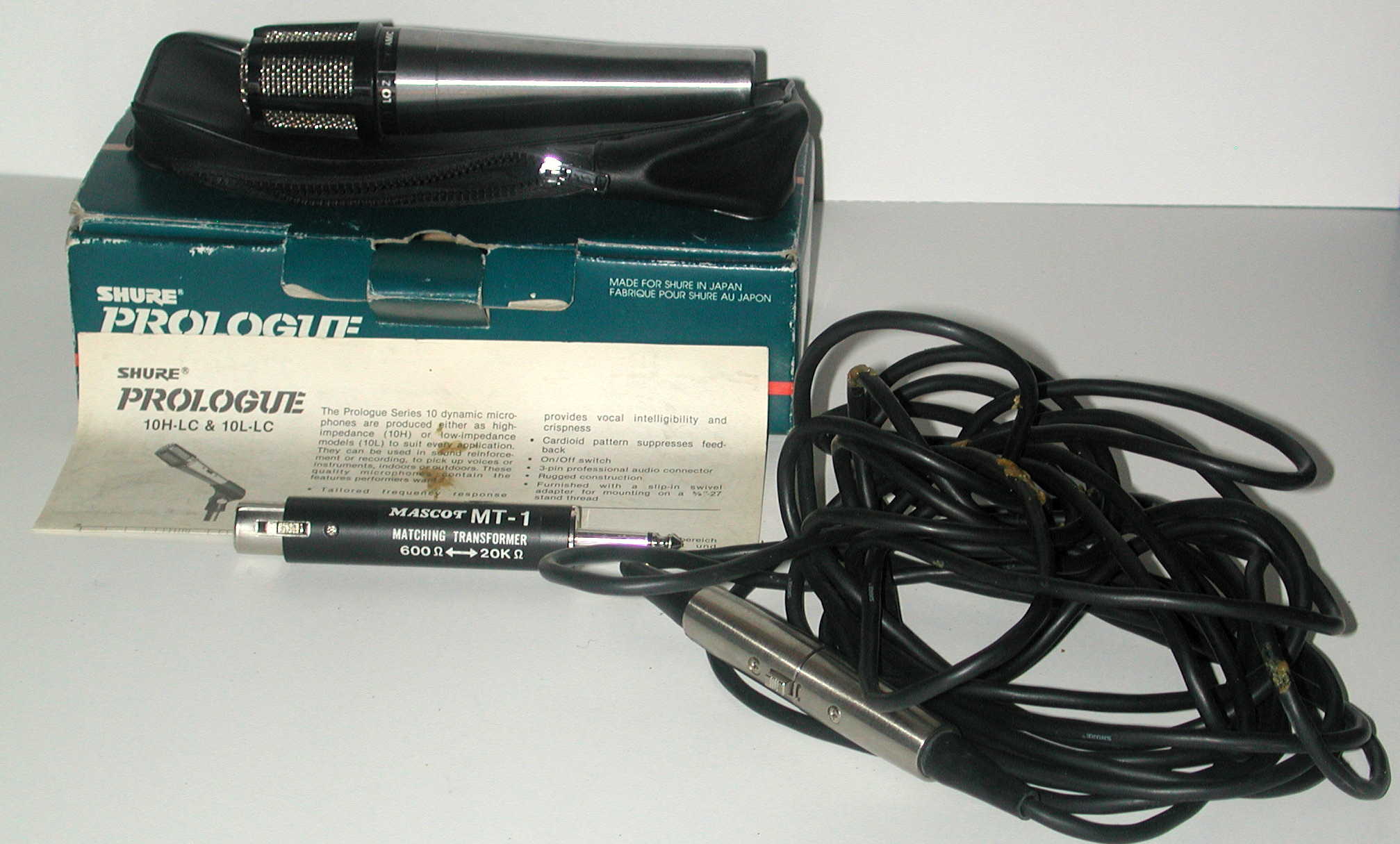 Shure Prologue Microphone. XLR3. Dynamic Cardioid 80Hz - 10KHz response. Includes carrying case. Also in box is 25 ft XLR3 to XLR3 cable and Mascot MT-1 Matching Transformer (600Ω female XLR3 to 20KΩ Male 1/4" phone plug).