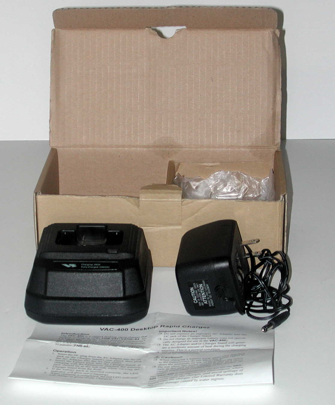 This charger is for the VX-150 and other Vertex Standard radios. It includes the desktop charging stand and the AC wall transformer. Comes with instruction sheet and original box.