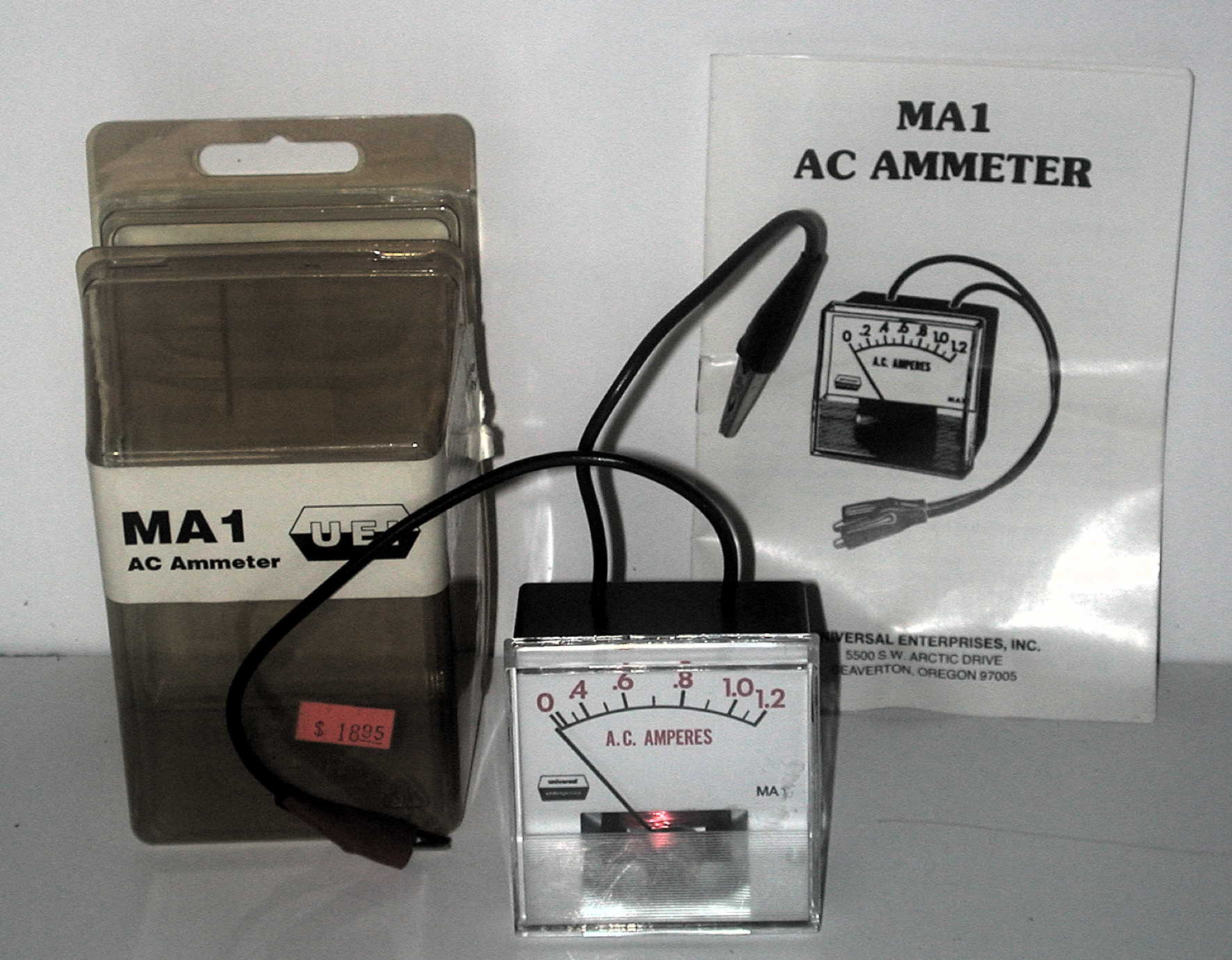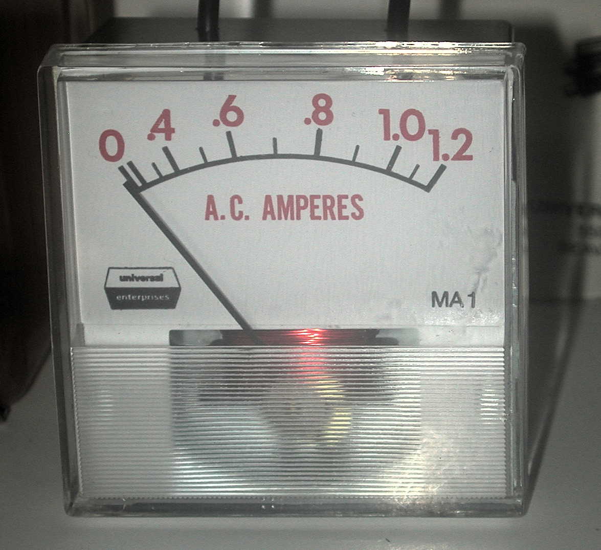 This is a small (2-1/4 x 2-1/4 AC Ammeter model MA1 by with a range of 0 - 1.2 amps at an accuracy of 3%. From the side of the box: This MA1 is a high sensitivity, direct reading AC ammeter. It is designed to simplify the setting of oil and gas thermostats and heat anticipators. The MA1 measures the performance of AC relays, solenoids and other low current AC devices. I'm sure radio hams can find a multitude of other uses.