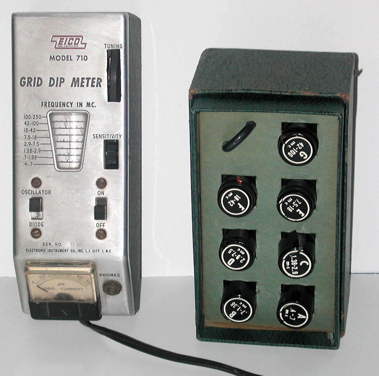 Eico 710 Grid Dip Oscillator with complete set of eight coils. Includes instruction manual. Frequency range 0.4 MHz to 250 MHz. Planetary drive tuning. Uses a single 6AF4A tube.