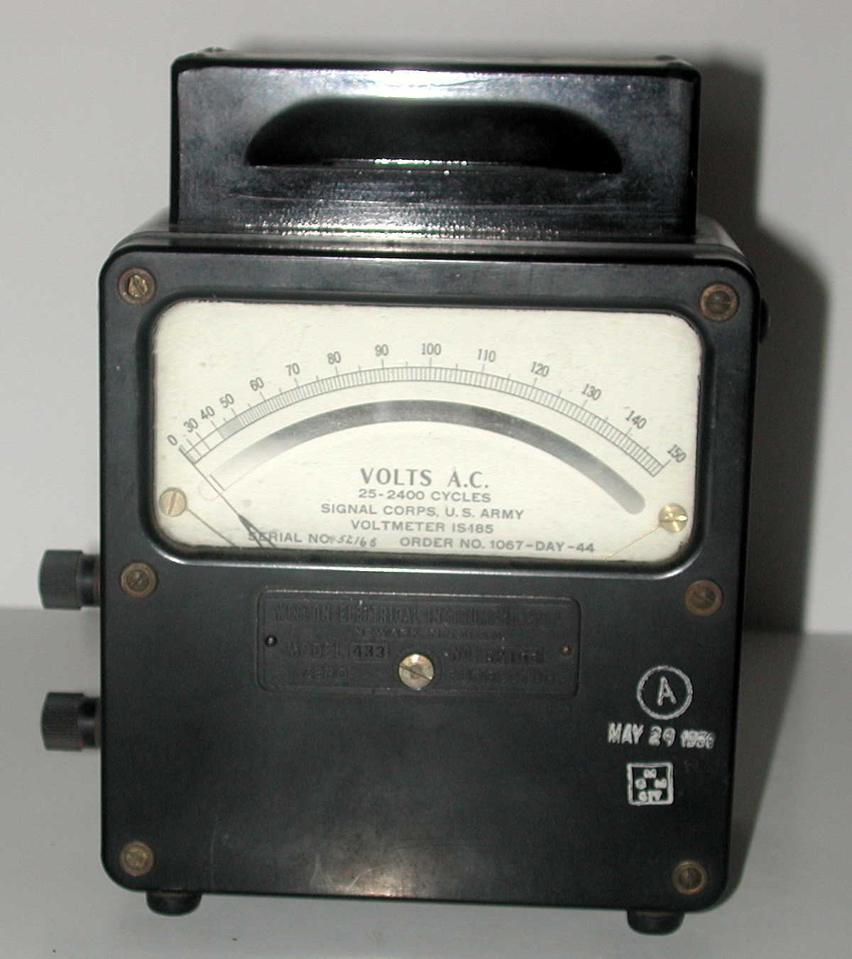 Laboratory AC voltmeter with mirrored scale. Ranges 0 - 150VAC. Frequency range 25 to 2,500 cycles per second.