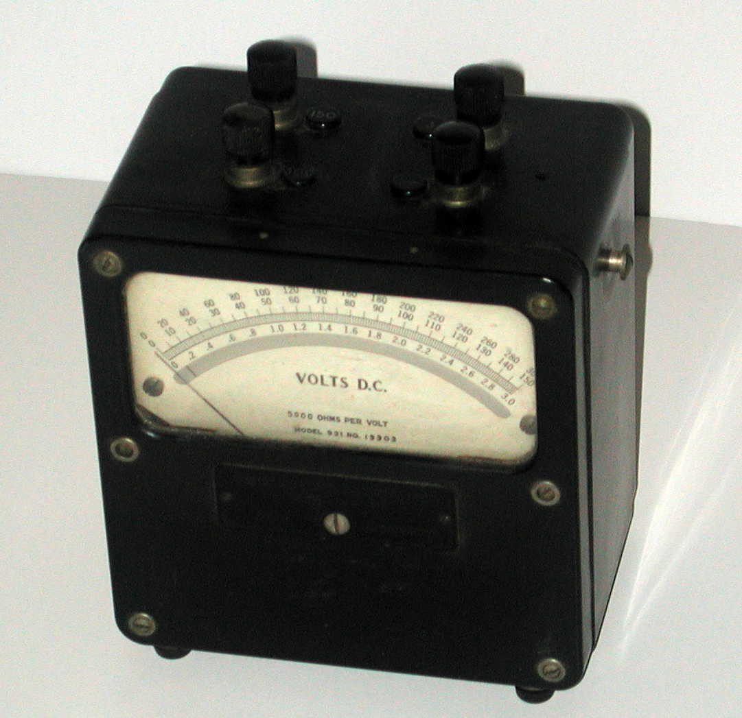 Laboratory DC voltmeter with mirrored scale. Sensitivity is 5,000Ω per Volt. Three ranges 0 - 3V, 0 - 150V & 0 - 300VDC.