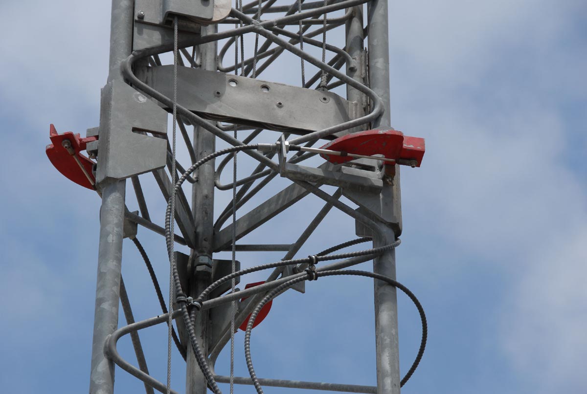 Here is a close-up view of the remotely controlled "toe-stops" on the 100-ft tower that provide a resting mechanism for each tower section when fully cranked-up.