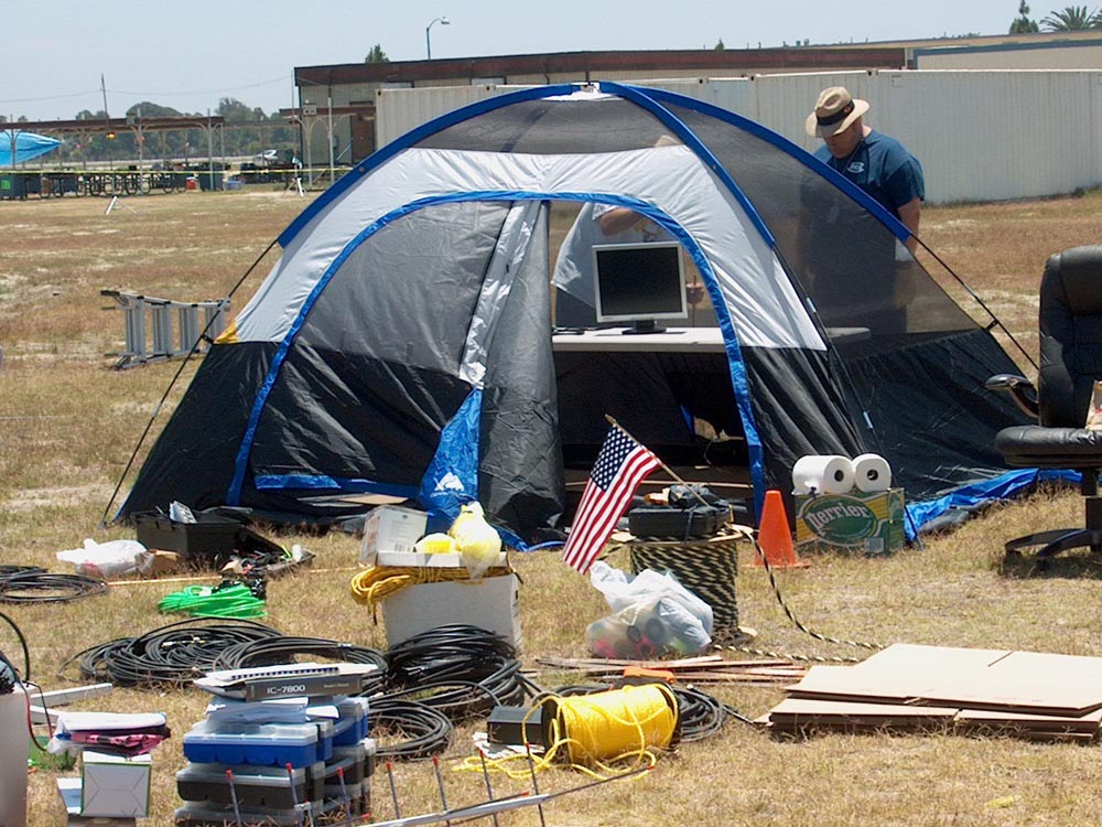 The 20M SSB station tent starts to take shape on Friday afternoon. Band Captain, Dan N6PEQ can be seen in the back of the tent by the flat-panel display with FD Chairman Willie-N8WP giving a hand.