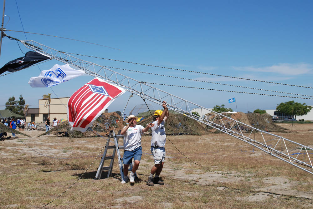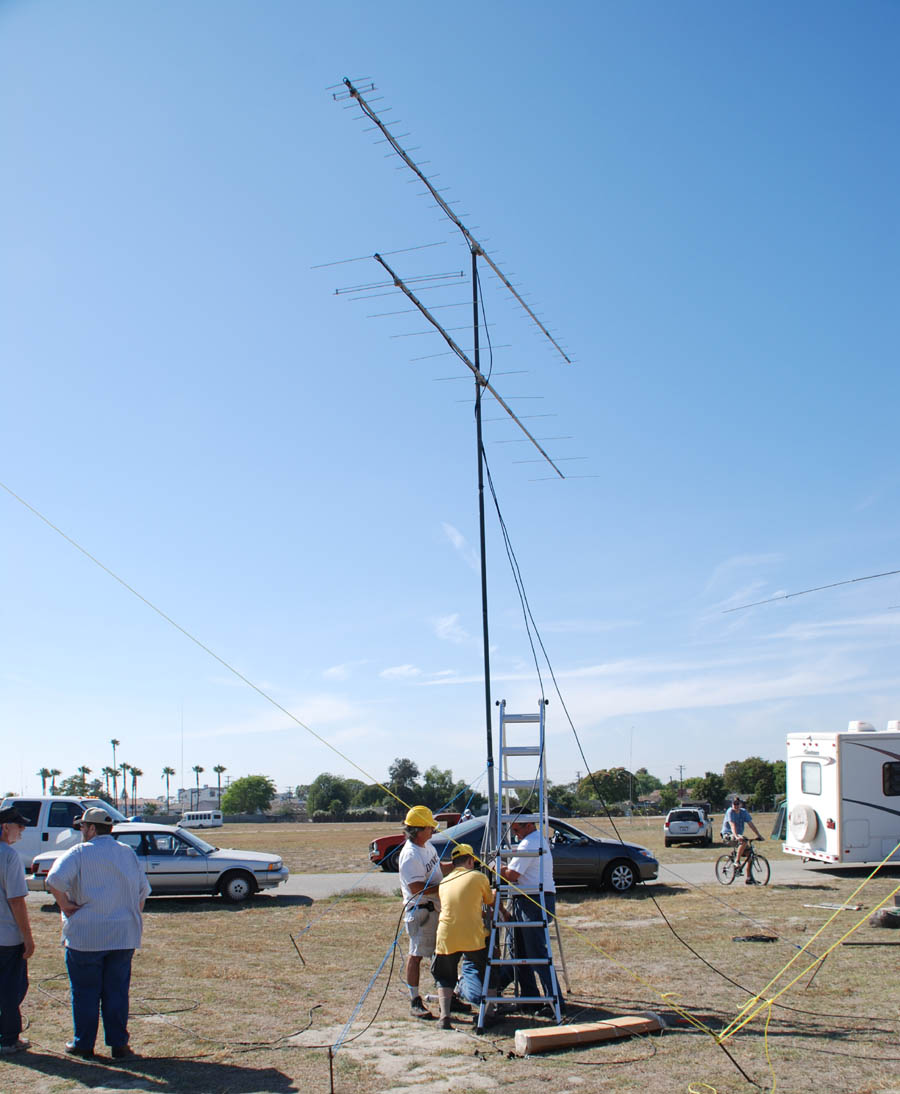 The 20M SSB Force-12  3-ele beam is almost in place. Dan-N6PEQ stabilizes th base while Ken-KI6DK holds one of the guy ropes.