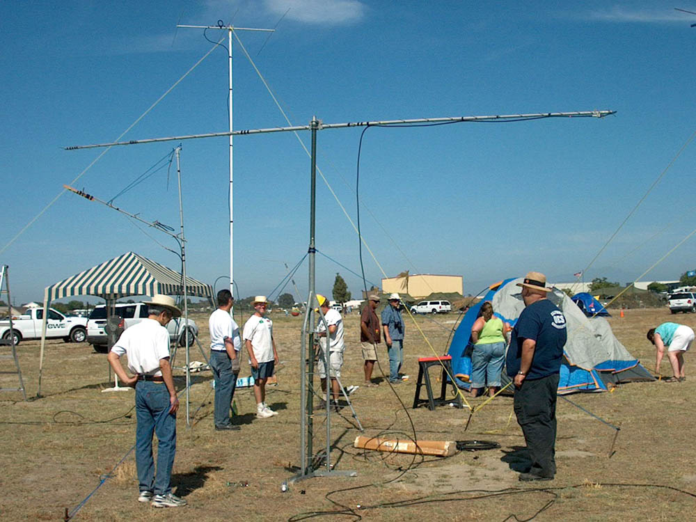 The antenna farm for 10M-SSB/6M/144/440/1.2 and satellite is being set up on Friday afternoon. The satelitte antenna is just above the canopy roof on the left-side of the picture. The 440 MHz Yaggi on the long boom is in the center of the picture on a short mast. The tallest antenna in this photo is a 3-ele 6M beam.