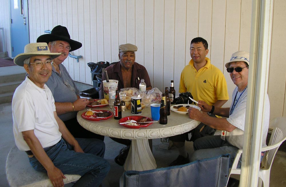 (L-R) Rich-KE6WWK (who was helping with the cooking), Bruce-KC6DLA, Ken-W6HHC, Michael-KI6DHT (seated), ??? (in orange blouse), and Bob-AF6C (seated with white hat).