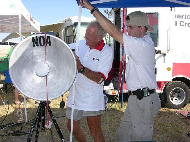 On the right is Tom Woodard-KI6GOA. of the Red Cross who set-up a display for Red Cross Disater Services and provided a tent and liquids for escape from the sun. On the left, Gordon West-WB6NOA puts finishing touches to setting a 10 GHz dish for some demos and points.