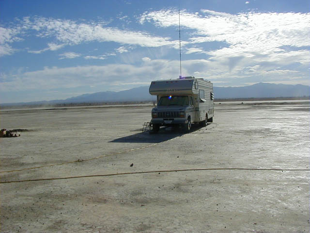 motorhome" of Larry-K6LDC with vertical antenna gleaming in the sun. The 5KW