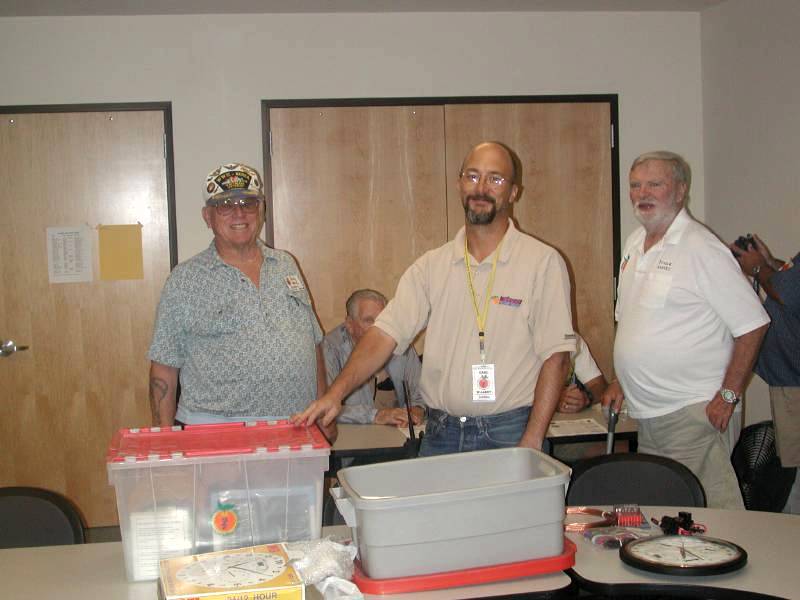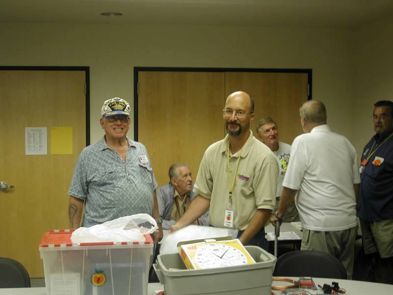 and Carl-WA6BSV discuss the raffle prizes while Frank-WA6VKZ