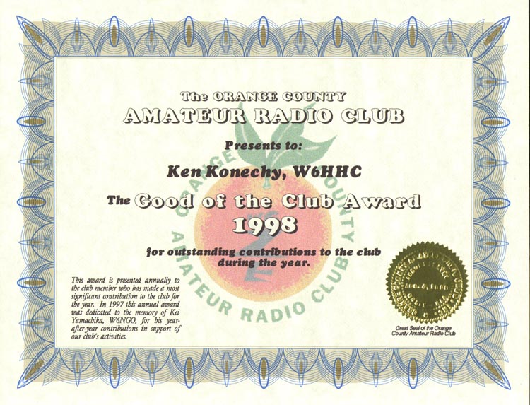 Award" is Ken Konechy (left) - W6HHC from the president Bob